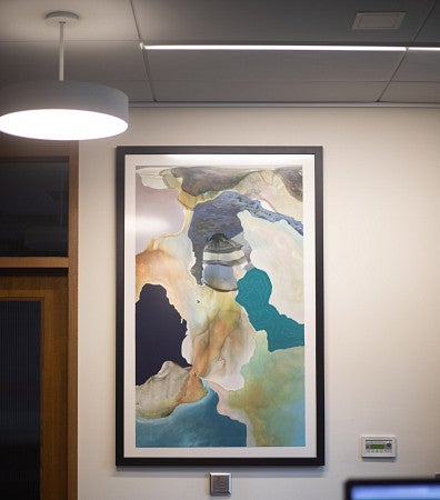 Upon entering through the main doors, visitors of Chapman Hall may notice a pop of color that replaced an old portrait of Robert D. Clark, the namesake of the Honors College. Now hanging in that spot is a watercolor painting of blues, browns, and greens – called Reservoir, by artist Susan Murrell.